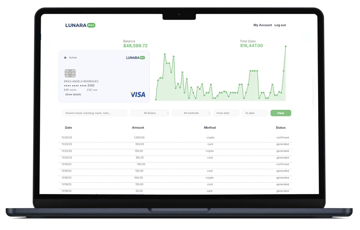 Lunara Pay is a modern payment processing platform built for digital entrepreneurs and high-risk businesses. We make it easy for you to accept global payments online — including credit/debit cards, Apple Pay, Google Pay, SEPA, and crypto-friendly options — with instant USDC payouts on the Polygon network.